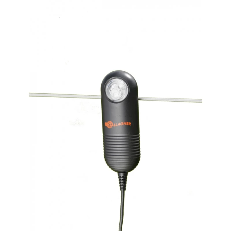 Controleert en waarschuwt met lichtsignalen of er nog voldoende spanning op de afrastering staat.