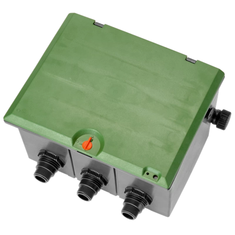 Voor max. 3 beregeningsventielen 9 V of 24 V. Flexibele watertoevoer van 3 kanten naar keuze. Telescoop-schroefverbinding voor eenvoudige ventielmotage/-demontage.