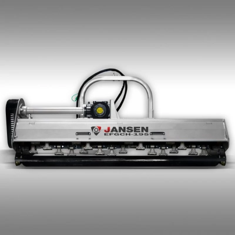 De klepelmaaier Jansen EFGCH-195 met hydraulische zijdelingse verschuiving kenmerkt zich door zijn bijzonder robuuste constructie. Deze klepelmaaier heeft een speciaal geharde haakse overbrenging en is optimaal als mulchmaaier, tractormaaier enz. inzetbaar.