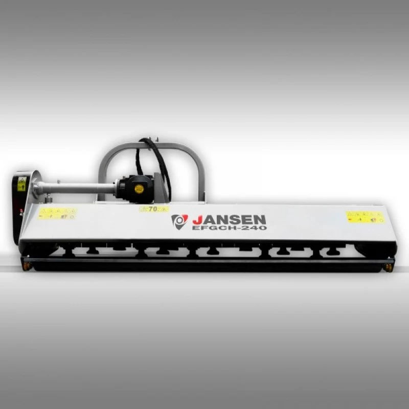 De klepelmaaier Jansen EFGCH-240 met hydraulische zijdelingse verschuiving kenmerkt zich door zijn bijzonder robuuste constructie. Deze klepelmaaier heeft een speciaal geharde haakse overbrenging en is optimaal als mulchmaaier, tractormaaier enz. inzetbaar.