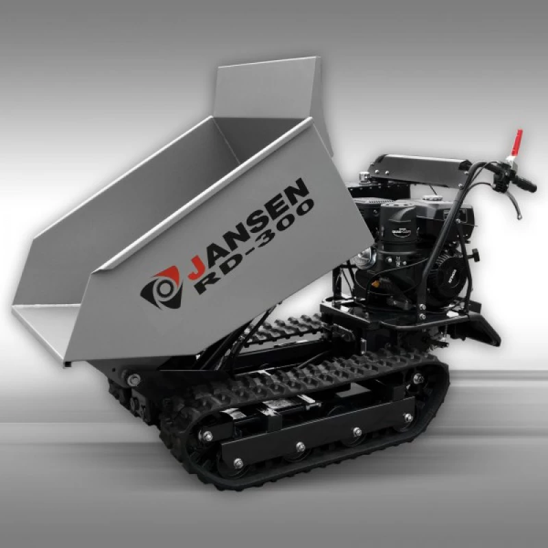 De rupsdumper Jansen RD-300 is een grote broed van onze RD-200 en is voorzien van een nieuwe, verbeterde 6:2 transmissie. Hij beschikt over in totaal 6 voorwaartse- en 2 achterwaartse versnellingen! De maximale snelheid is voorwaarts ca. 8 km/h en ca. 5 km/h achterwaarts. Hij is ideaal geschikt voor het transporteren van zand, aarde, kiezel, stenen enz.