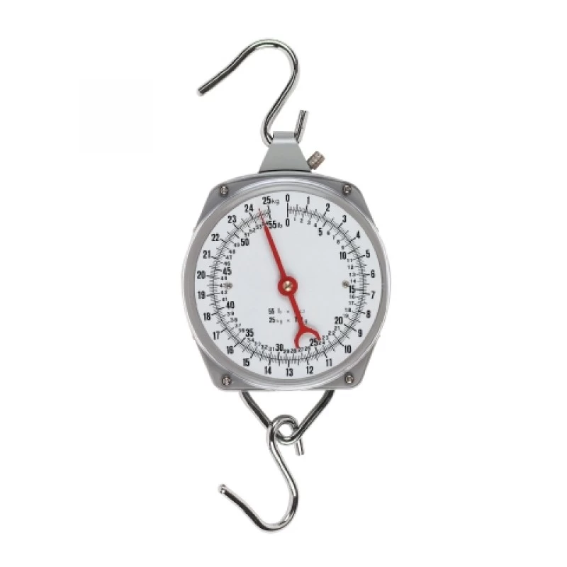 Weegklok, 25kg, schaalverdeling 100gr.hangweger tot 25kg met 100gr aanduiding weegschaal, hangmodel met schaalverdeling. inclusief losse haak. metalen behuizing.