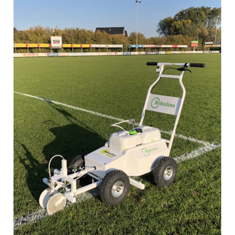Een degelijke en gebruiksvriendelijke belijningswagen samengesteld van hoogwaardige materialen. Geschikt voor concentraat, met water vermengbare, belijningsverf maar ook de kant en klare belijningsverf Rofraline EASY. Met in breedte en hoogte in te stellen ronde markeerschijven. Deze kunnen zelfs op het gras ‘meelopen’. Uitgerust met krachtige pomp en accu voor een constante druk. Keuze om spuitgedeelte recht voor of aan zijkant te bevestigen. Zie ook foto’s.